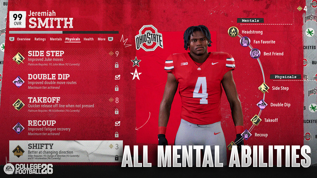College Football 26‘s Mental Abilities help players during specific situations in a game. Overall, the game features 16 different Mental Abilities that your players could potentially have in Dynasty or Road to Glory. Furthermore, each Mental Ability has four tiers, followed by a new Heisman Tier, which the developers added this year. Therefore, we listed all Mental Abilities for your convenience.