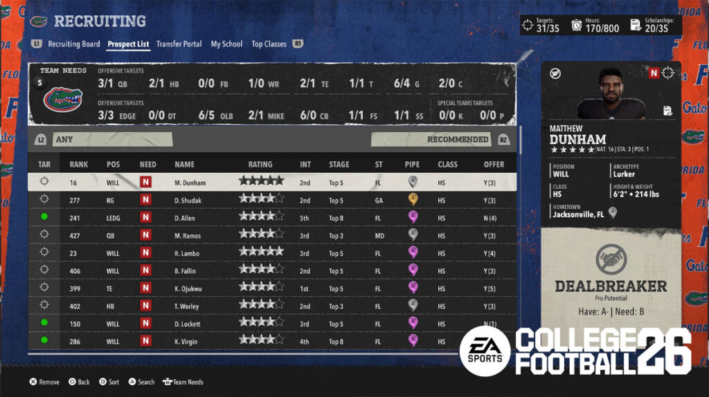 In the College Football 26 Recruiting board, you can take the necessary steps to scout and acquire players you want. All players that you added from the Prospect List will be here, and you can even filter by position and other things, if you like.
